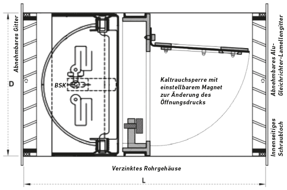 - Bestehend aus einem Rohrgehäse aus verzinktem Stahlblech, einer Brandschutzklappe EI90(S), beidseitigem Aluminiumabdeckgitter sowie bei der Type PUEDLRK einer Membran-Kaltrauchsperre.